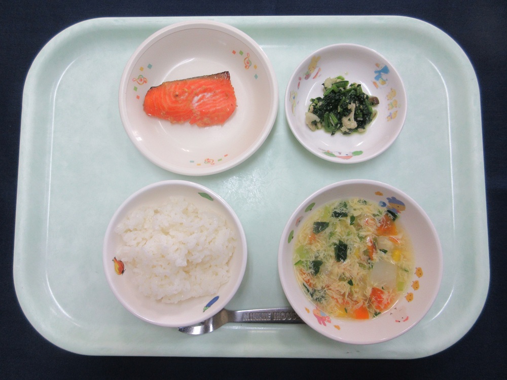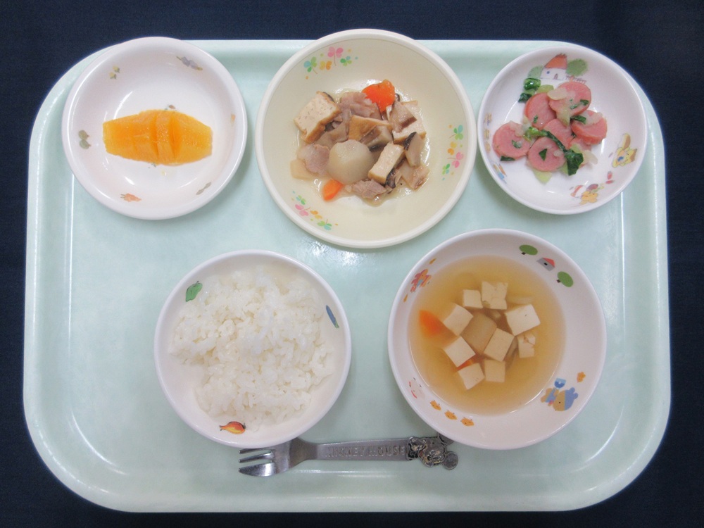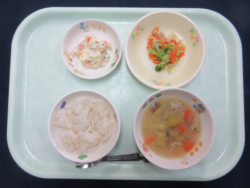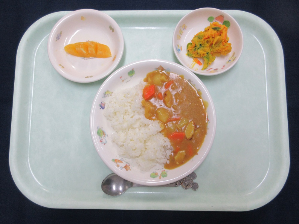 10月 献立 2025/10/30 ちくわカレー かぼちゃサラダ オレンジ ブロッコリー入り野菜炒め ポテトサラダ さつまいもの茸汁 鮭の味噌焼き ほうれん草としめじの炒め とうもろこしスープ さといもと生揚げの煮物 ウインナーソテー お麩の味噌汁 オレンジ
