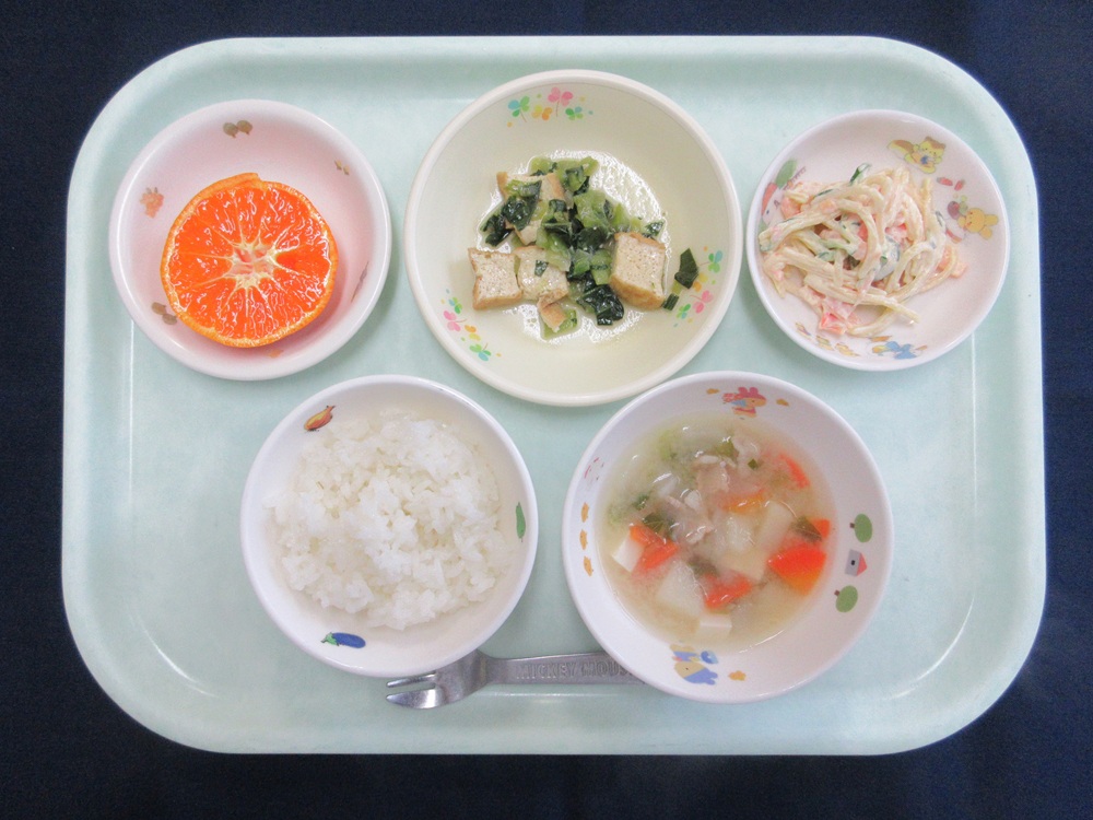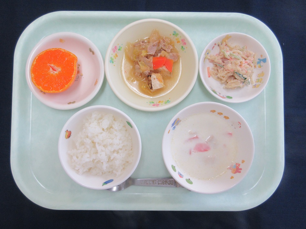 1月 献立 2026/01/29 白菜のクリーム煮 キャベツのフレーク和え オニオンスープ 輪切りみかん 韓国風スタミナ炒め ほうれん草のお浸し とうもろこしスープ 鮭の西京焼き 三色ナムル 豚汁 オレンジ すき焼き風煮 春雨サラダ チキンミルクスープ 輪切りみかん 厚揚げとチンゲン菜の炒め スパゲッティサラダ かぶの味噌汁 輪切りみかん
